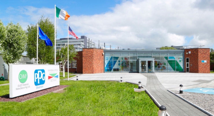 Universal Display Corporation (UDC) and PPG officially opened a new state-of-the-art organic light-emitting diode (OLED) manufacturing facility in Shannon, Ireland. This County Clare site is expected to double the production capacity and further diversify the worldwide manufacturing footprint for UDC’s energy-efficient phosphorescent OLED emissive materials for the growing OLED market. UDC’s initial investment of €10 million, and subsequent multimillion-euro expenditures and multiyear, multiphase expansions of the site are expected to have a significant positive economic impact on the region. PPG produces UDC’s highly-efficient, high-performing UniversalPHOLED materials. There are currently 50 people working at the new production site, and the headcount is expected to increase up to 100 as further investments roll out. The high-tech roles at the Shannon facility include engineering and operational disciplines, supply chain roles, synthetic chemists, and analytical technicians. PPG has been UDC’s exclusive manufacturer of phosphorescent OLED emitter materials since 2000. Broadening global manufacturing operations in Ireland builds on that longstanding partnership. The new facility in Shannon expands upon PPG’s established OLED production facilities located in Monroeville, PA, and Barberton, OH. Speaking at the event to mark the official opening, Norma Foley TD, Minister for Education, said, “The opening of this state-of-the-art new facility in Shannon is a significant development for the Mid-West region and is an endorsement of the Government’s continued focus on science, technology, engineering, and maths (STEM) academic programmes and the calibre of workforce we have here in Ireland. By working in partnership, PPG and UDC have grown exponentially, broadening global manufacturing operations in Ireland, building on successful foundations and developing this impressive Shannon facility. I would like to congratulate UDC and PPG on the opening of this high-tech facility and wish them every success in the future.” “We are delighted to celebrate the opening of our new OLED manufacturing site with PPG, our long-term partner of more than two decades, as well as esteemed Ireland elected officials, key associations and colleagues,” said Steven V. Abramson, president and CEO of Universal Display Corporation. “This new site represents a major infrastructure investment for the future of the OLED industry. The region’s great workforce talent, driven by strong education systems here in Ireland, and its commitment to innovation helped our decision process in selecting Shannon as the facility’s location. We look forward to continuing to work with our partner PPG, as well as the Irish Government through IDA Ireland, as we continue to invent, develop and deliver state-of-the-art phosphorescent OLED materials.” “PPG is proud to be a strategic partner of UDC. Our work together in the production of OLED materials and technologies is driving sustainable innovation in the consumer electronics industry,” said Tim Knavish, PPG president and CEO. “The opening of this new facility in Shannon reflects the availability of skilled talent in Ireland’s Mid-West region and our commitment to supporting the growth of the local economy. We are grateful for the support of the Irish Government through IDA Ireland.” To enhance the energy efficiency, colour gamut and lifetime of OLED displays, UDC’s phosphorescent OLED emitters are used in virtually every OLED display in the world such as consumer electronic products ranging from smartwatches and smartphones to laptops, tablets, automotive and TVs, including foldable and rollable consumer electronic products.