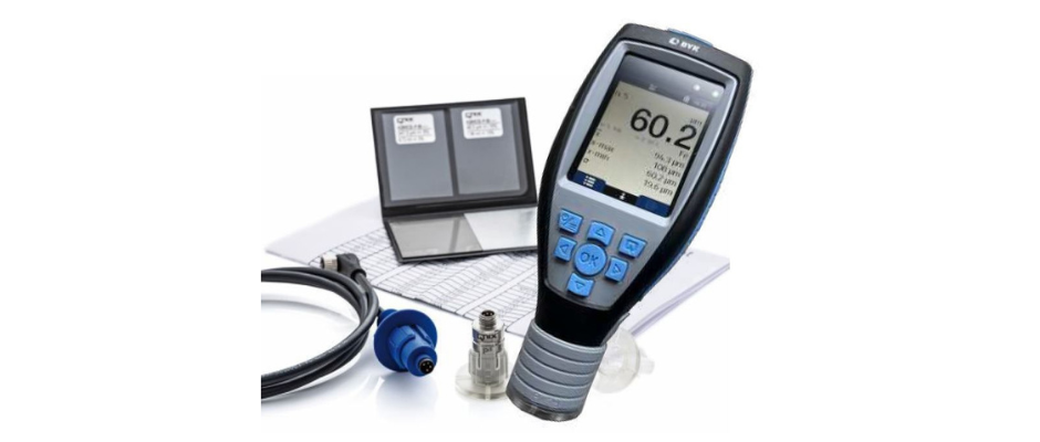 Dry film thickness gauge for Fe/NFe substrates with fixed and cable sensor.