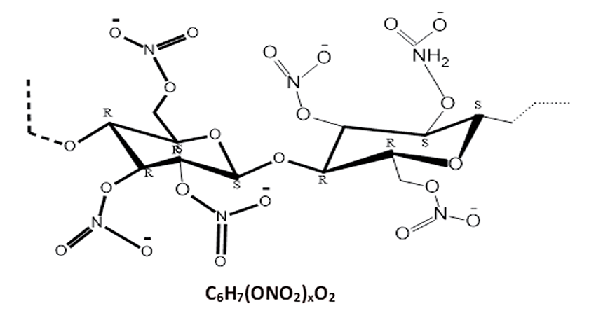 NC is the nitro-derivative of cellulose, which is obtained through a reaction with sulfuric and nitric acids. This reaction replaces the hydroxyl groups (OH–) in cellulose with nitro groups (NO2–), as shown in Eq. (A) (McKeen, 2017).
