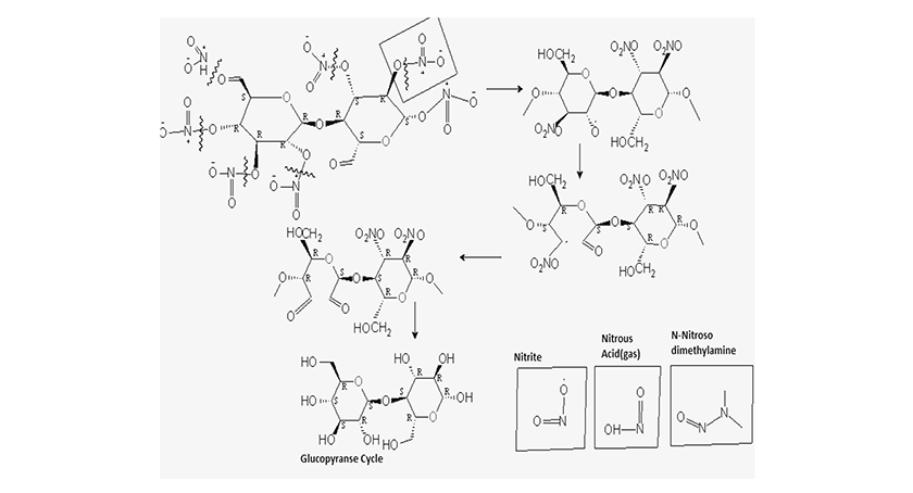 These reactions result in the removal of nitrate groups and their replacement with hydroxyl (–OH) groups, leading to a decrease in the material’s degree of substitution.