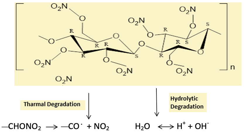 Nitrocellulose degradation begins with the homolytic scission of nitrate groups, releasing – NO2• radicals, which then form nitrous and nitric acids via H-abstraction or reaction with water. This de-nitration process is followed by cellulosic backbone scission, primarily at the glycosidic bond, triggered by hydroperoxides formed during photo-oxidation. The result is the formation of hydroxyl groups, gluconolactone, and ultimately, acid powder, leading to a decrease in the material’s nitrogen content and molecular weight.