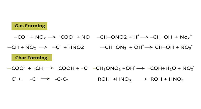 The degradation process begins with the separation of the O–NO2 bond, leading to the formation of NO2. Subsequently, nitroxylated groups are formed as oxidation products and concurrently produce peroxyl groups (Dauerman and Taijima, 1968; He et al.,2017)